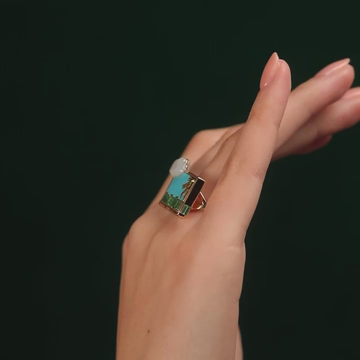 Plaque ring depicting a nature scene. Composed of a turquoise sky, mother of pearl cloud, yellow sapphire sun and emerald grass in 18 karat yellow gold