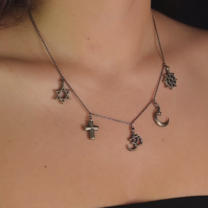 Love Thy Neighbor necklace with a Crescent & Moon, Cross, Dharma Chakra, Pranava & Star of David symbol in blackened 18-karat yellow gold.