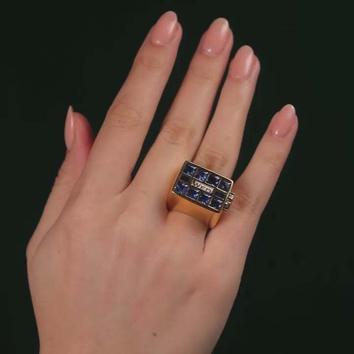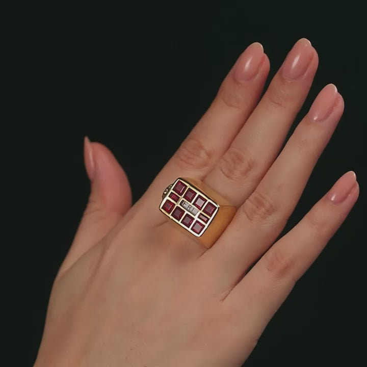 A heavy signet ring set with square and baguette rubies, diamond set dial with revolving enamelled barrel depicting the days of the week in 18 karat yellow gold
