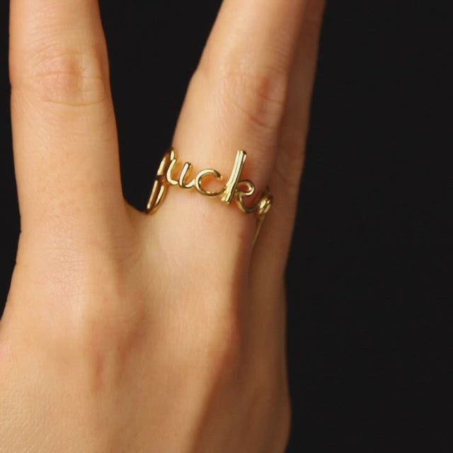 The word Fuck Off in delicately twisted, beaten and curved gold