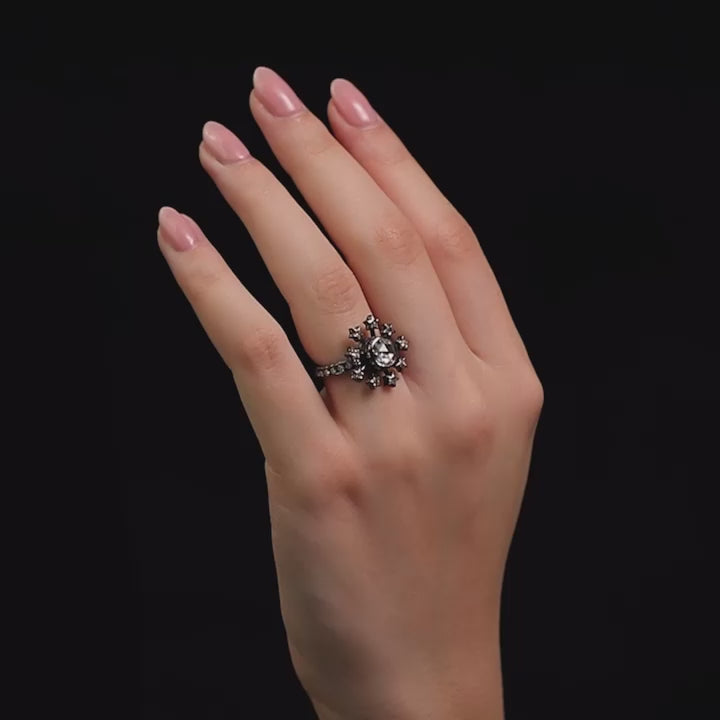 Featuring star-cut diamonds and a central rose-cut diamond set in blackened 18 karat white gold, this ethereal piece pays homage to the skies.