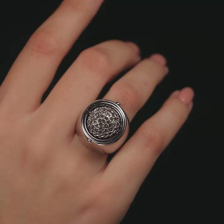 An enamel dome swivels to reveal a brilliant cut diamond sitting in a pavé diamond set cup in 18 karat yellow gold