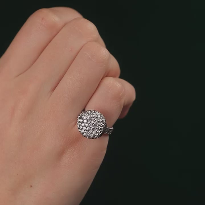 A pavé set diamond ring available in 18 karat yellow gold, 18 karat white gold and blackened 18 karat white gold