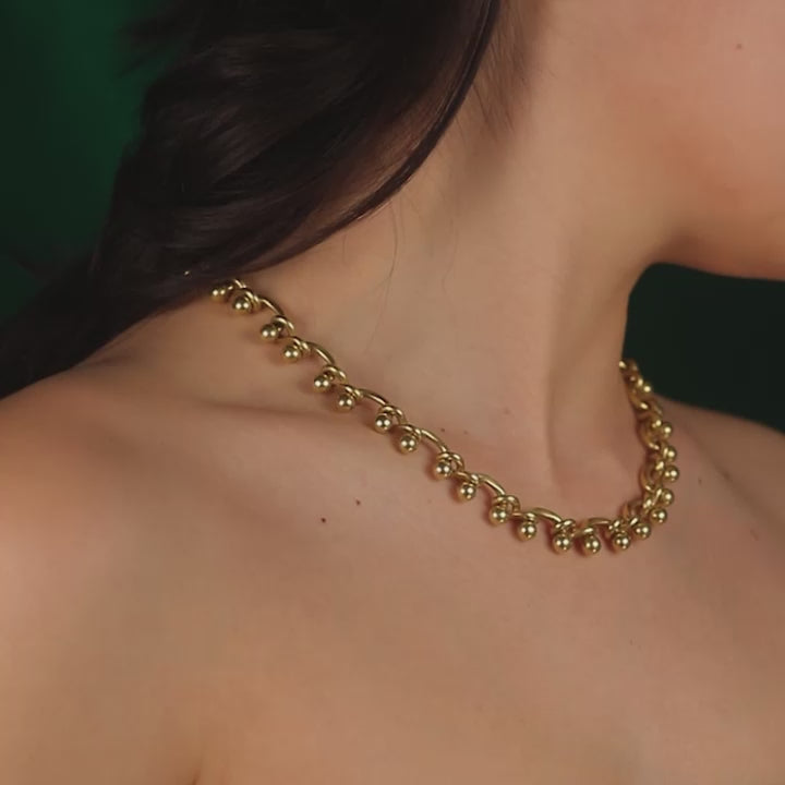The Solar necklace is made from Solange's signature gold chainlink. A figure of 8 represents the trajectory of the planets around the sun, looping forever around the golden orb of sunshine. As satisfying and substantial as one could want